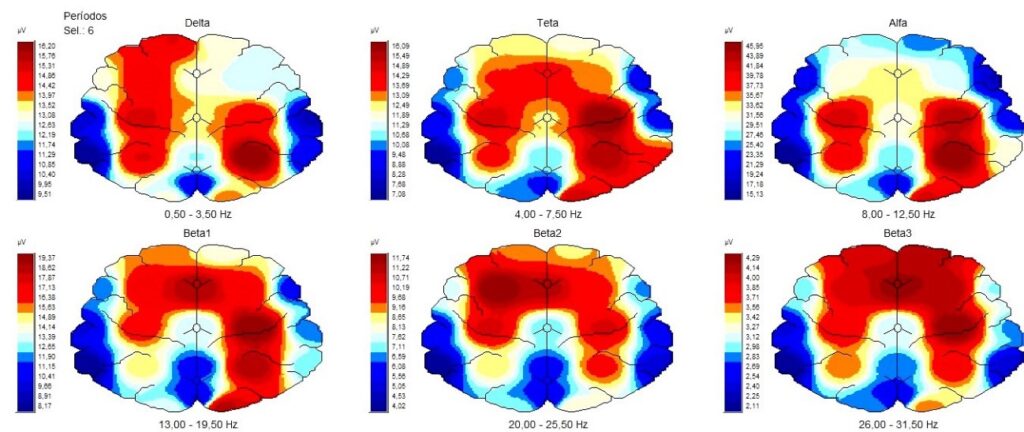 Dessa forma, o exame possibilita uma visualização precisa da localização das descargas epileptiformes no cérebro. Com isso, é possível obter informações quantitativas a respeito da atividade elétrica cerebral de base, comparando variações inter e intra-hemisféricas como nas imagens abaixo: